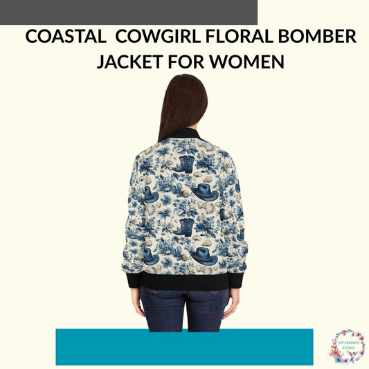 Blue Coastal Cowgirl Floral Print Fashionable Bomber Jacket For Women - Stylish And Chic Outwear For All Seasons