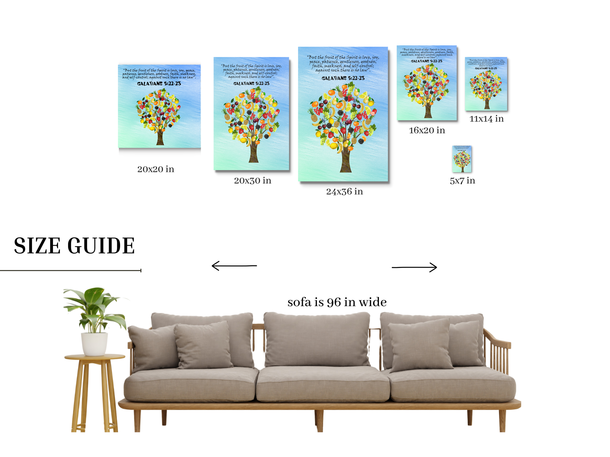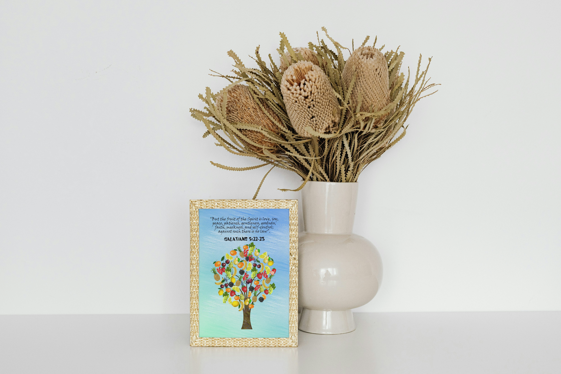 Do you like Christian art? Well, Enjoy this Fruit of the Spirit Fruits Christianity Inspired Wall Art Print. The bible verse for the Fruit of the Spirit is Galatians 5:22-23 and there are 9 Fruit of the Spirit Fruits including love, joy, peace, patience, gentleness, goodness, faith, meekness, and self-control. Take it home today or get it as a gift for someone you love.