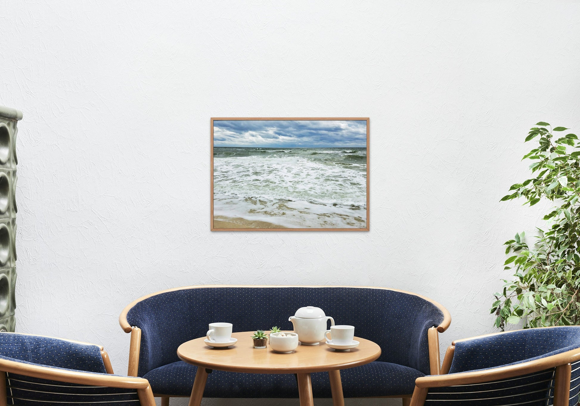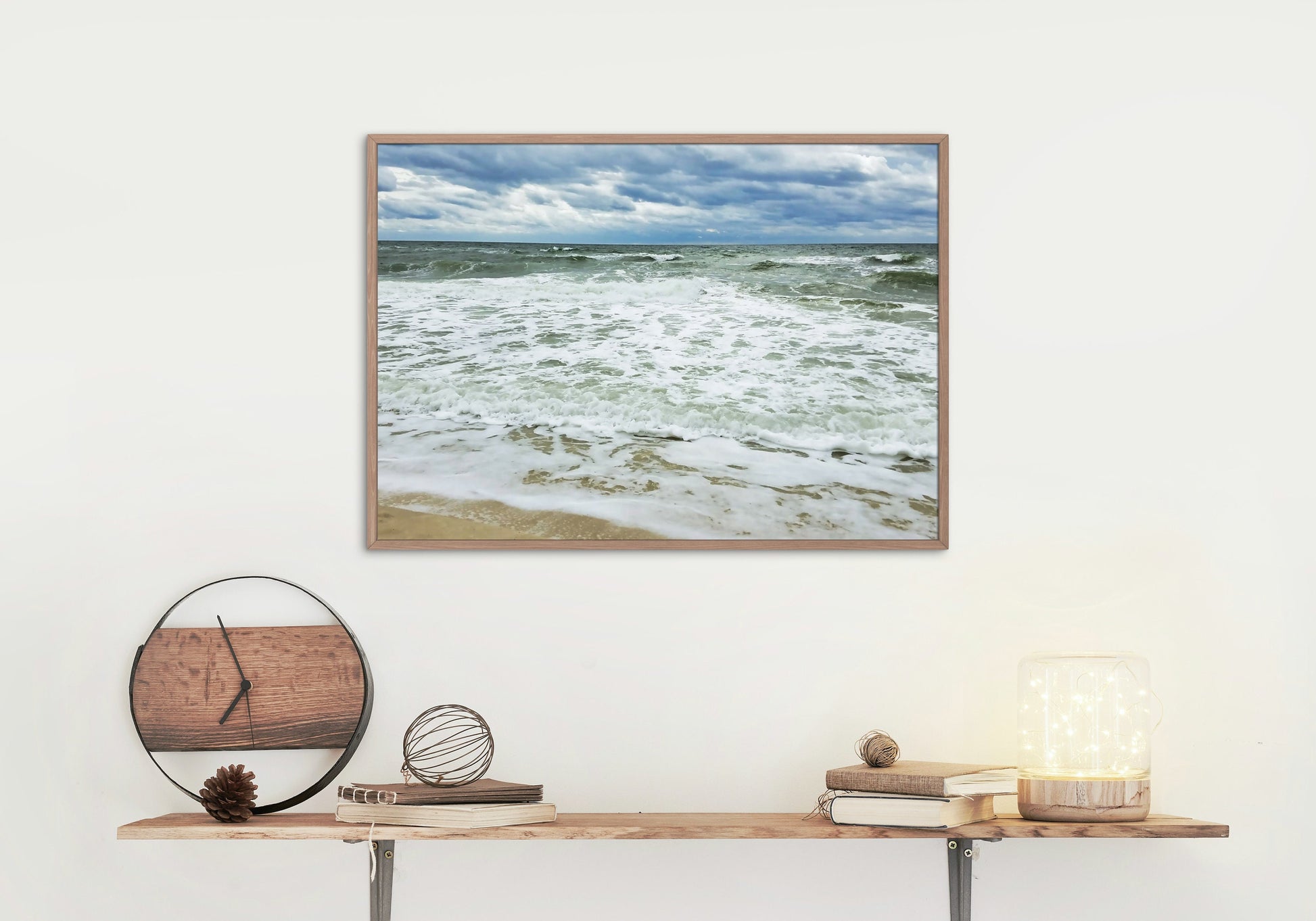 This scenic beach print of the Gulf of Mexico was taken on the beach at Gulf Shores along the Alabama coast on a beautiful sunny day. The blue sky with clouds contrast against the graying green waves with white rolling crests along the shoreline. This would make a great gift for beachcombers or beach lovers. This beautiful nautical print would also make a great housewarming gift or birthday present.