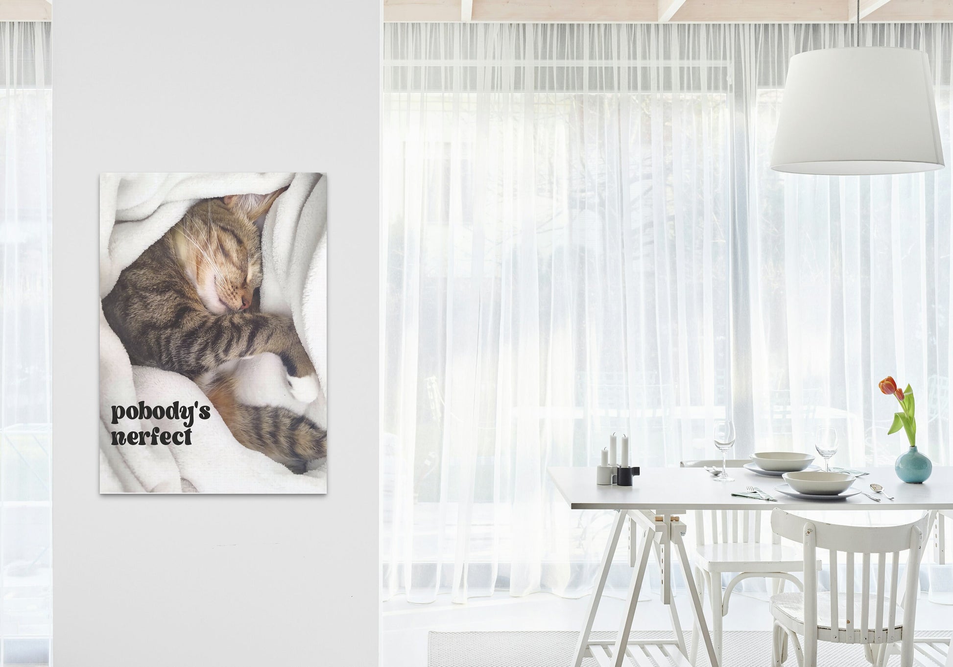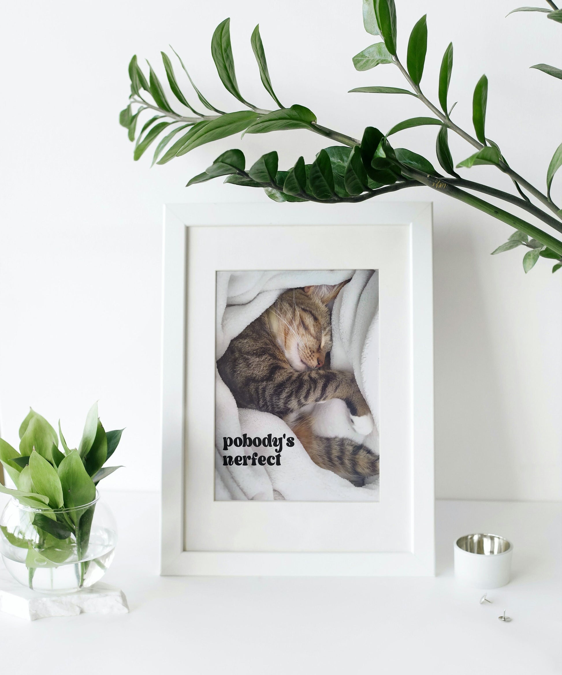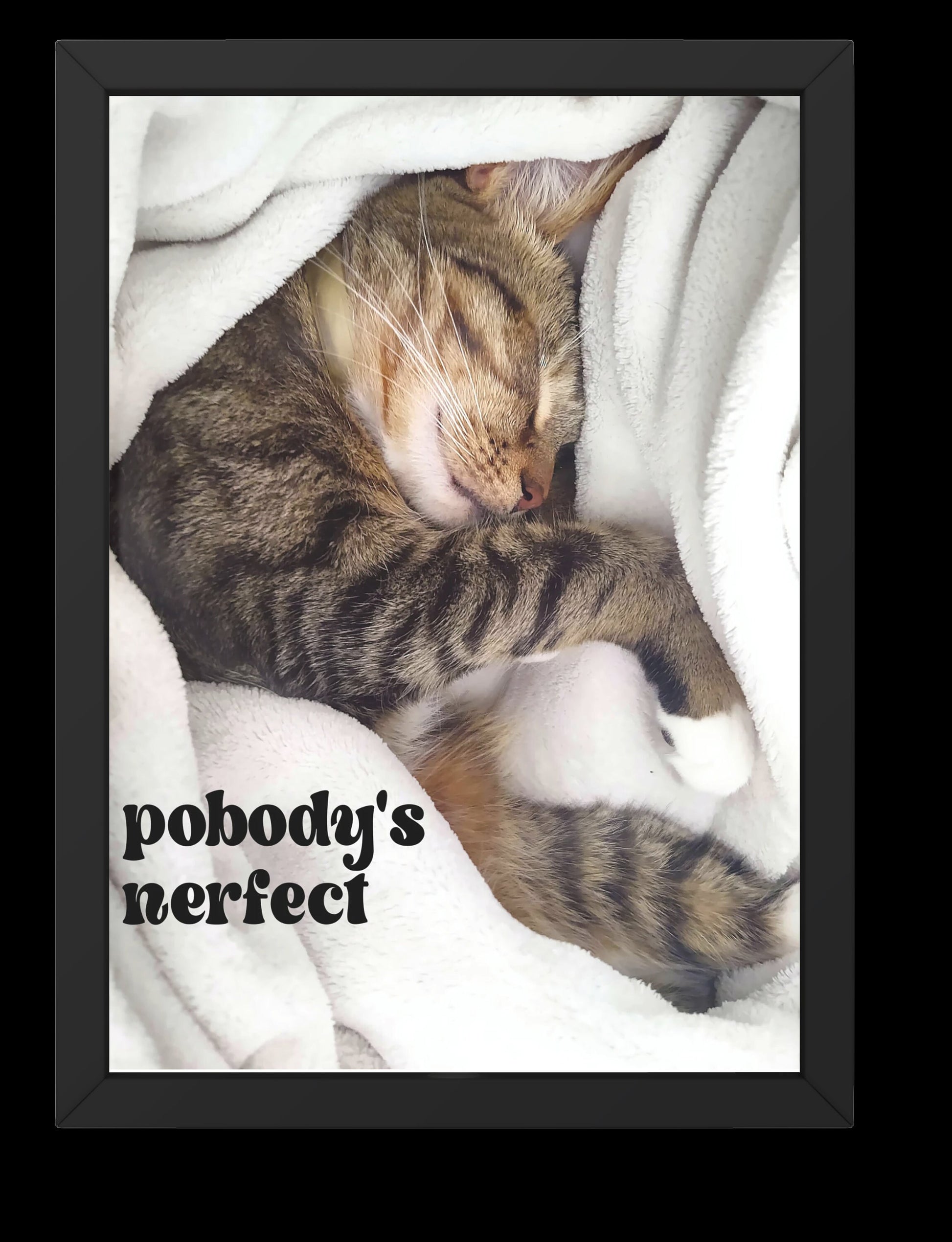 This cute and inspirational "Pobody's Nerfect" aka Nobody's Perfect Clute Sleeping Cat digital art print is a great gift for any cat lover or animal lover. If you love inspirational quotes and adorable cats, this digital print is for you would look great in any room in your house or office.